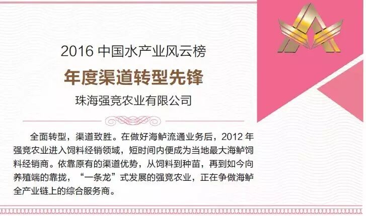 凭借在全产业链转型上的出色表现,强竞也获得了“2016中国水产业风云榜年度渠道转型先锋”奖。