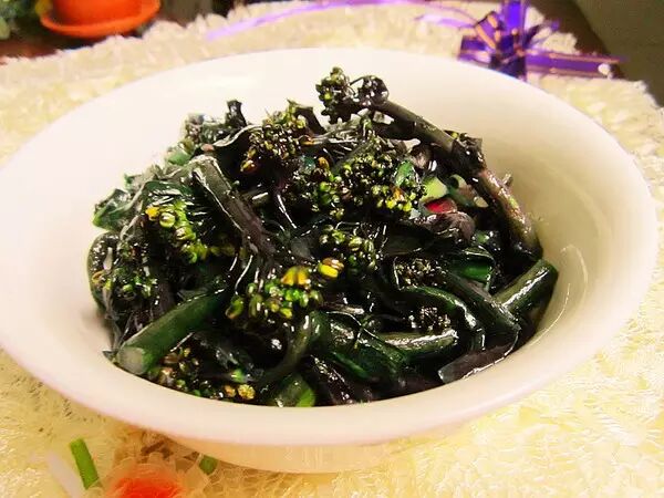 1.将菜苔掐成寸段,底部粗根茎那儿要先去除皮;去皮的粗根茎一分为两半;