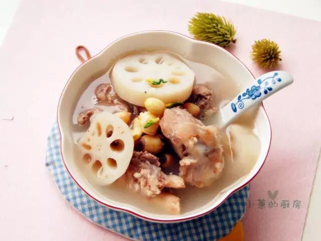 6.小火慢炖半个小时到四十分钟后放入莲藕,再小火炖四十分钟到一个小时,莲藕粉糯,调入盐和鸡精即可。