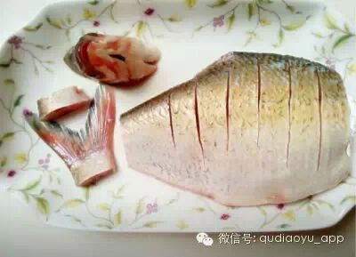 1.鳊鱼洗净后,切下头尾,处理掉所有的鱼鳍,如图,在背部划开刀口。
