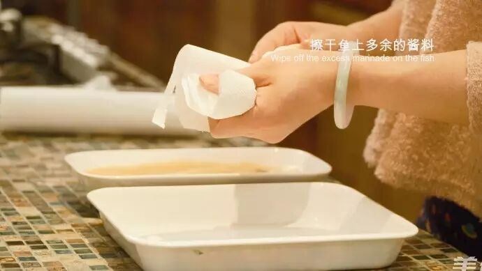 取出腌好的鱼,擦干鱼上多余的酱料,将烤箱预热200°