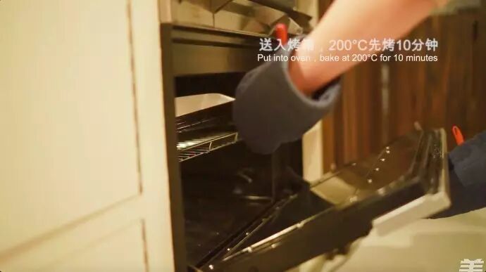 将鱼送入烤箱上层,鱼皮朝上,200°C先烤10分钟