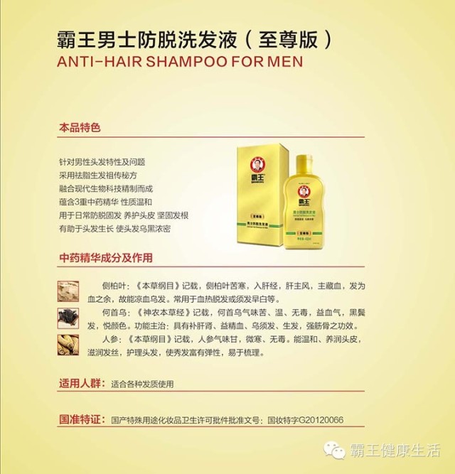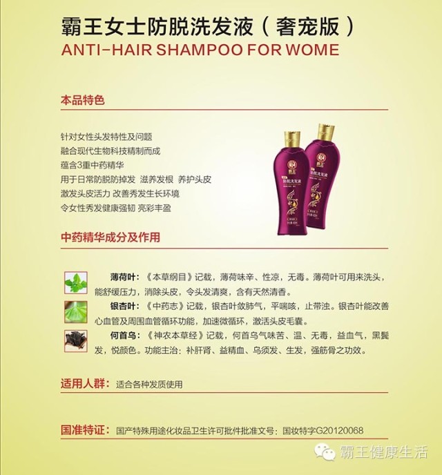 产品介绍:本品是由源于中药世家的霸王,传承祖传配方,针对女性头皮问题,采用生物破壁技术和超凝界萃取技术从精选上乘中草药薄荷叶、何首乌、银杏叶中浸泡蒸煮熬制成防脱复合原液,融合现代生物科技精制成霸王防脱洗发液。其性质温和。经常使用可防脱育发、养护头发、坚固发根、并有助于头发生长、减少脱发和断发。无脱发者使用,可预防脱发,令头发乌黑浓密。