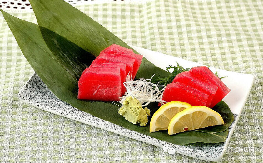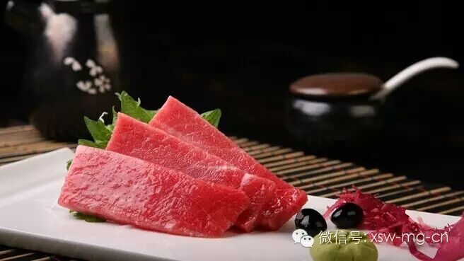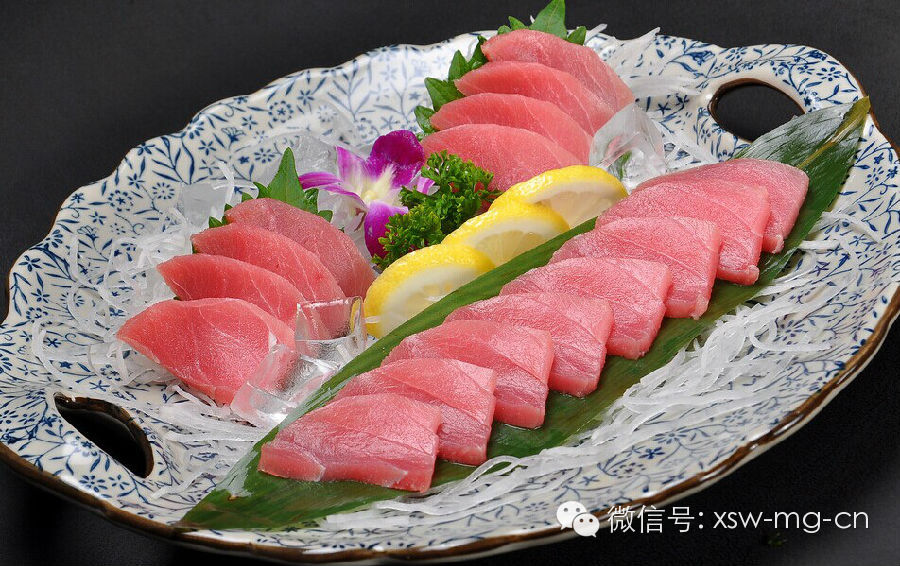 ● 低脂肪、低热量,富含优质蛋白质及多种营养素,是现代女性轻松减肥的理想选择。 蓝鳍金枪鱼——享有“金枪鱼之王”、“鱼中劳斯莱斯”的大名。 蓝鳍金枪鱼之所以矜贵,一来蓝鳍体型很大,体重能达500公斤,全部在无污染深海远洋捕捞;其二蓝鳍产量极少,而且越来越少,而整条蓝鳍金枪鱼最让食家趋之若鹜的当然数鱼腩位:蓝鳍拖罗(TORO)。其油香四溢,油脂如雪花般密布,口感像雪糕一样入口即融,妙不可言!世界饮食界均以“融化在舌尖的美食”来美誉它。 金枪鱼各个部位不同,其口感、味道都会有所变化,颜色较为深红的位置一般是背部,口感嫩滑细腻;而鱼腩由于油脂丰富,颜色较背部颜色浅,而体型大的金枪鱼我们还把鱼腩位置分成腹边、大腹和中腹,腹边口感爽脆油香四溢;而大腹口感像雪糕一样入口即化;金枪鱼多层次的美味口感,是世界公认的“刺身之王”