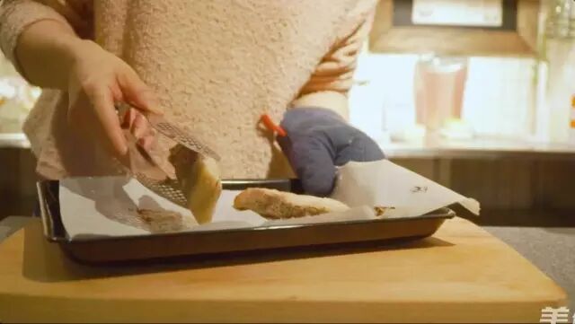 6、取出腌好的鱼,擦干鱼上多余的酱料,将烤箱预热200°