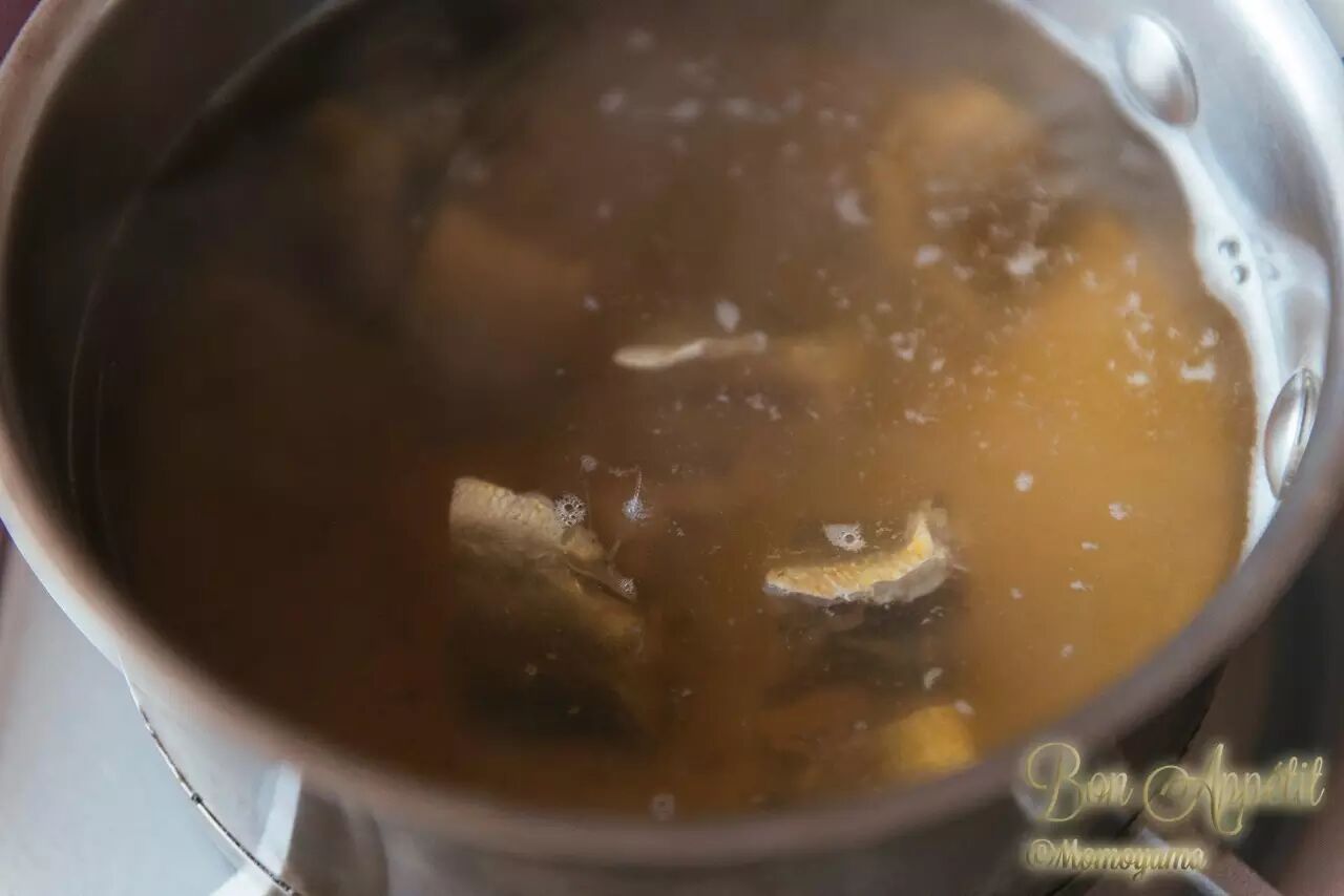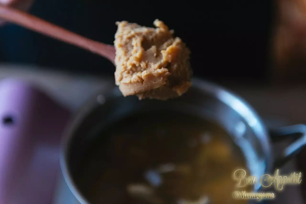 4. 澄清的高汤倒回原先的锅中开火加热,把之前处理的小黄去除头部和尾部,分成2-3段加入到汤中。煮沸后转小火,加入白味增。待完全调开后,小火煮1-2分钟即完成。