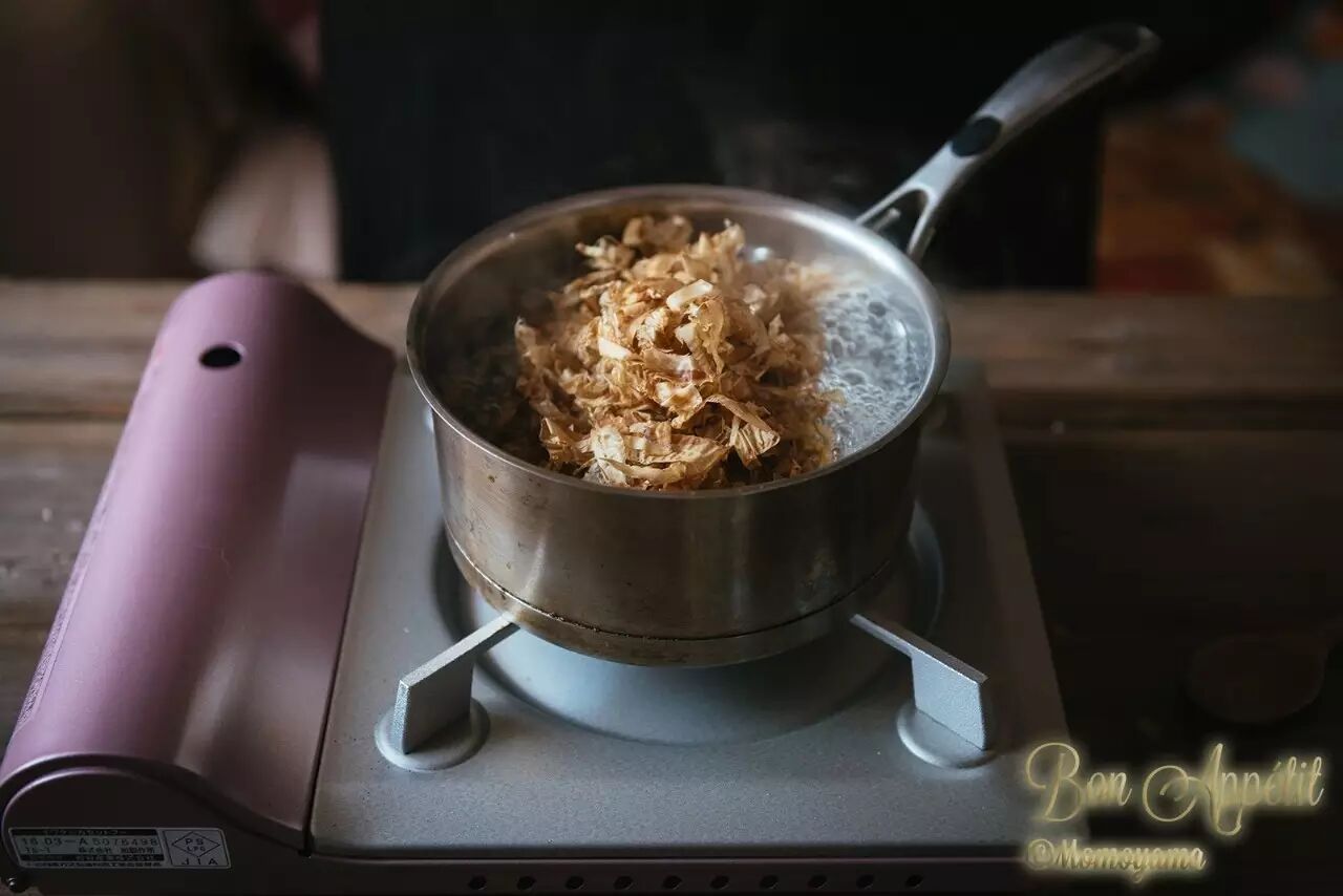 3. 锅里加白水放入昆布浸泡1小时左右,开大火煮至沸腾,转小火加入木鱼花。再次沸腾后,关火,过滤汤汁。