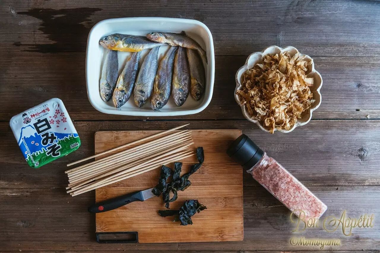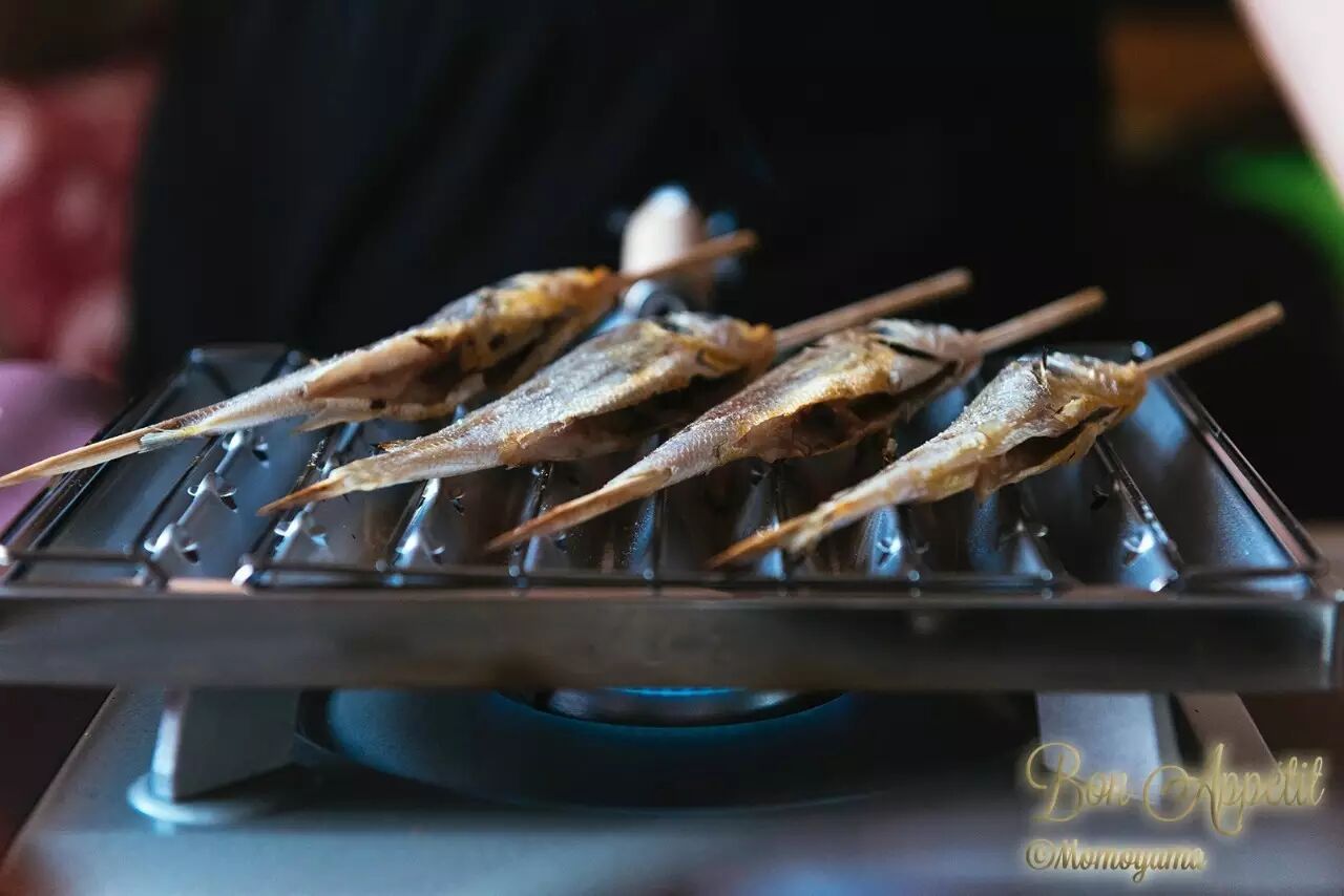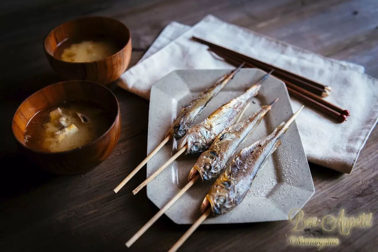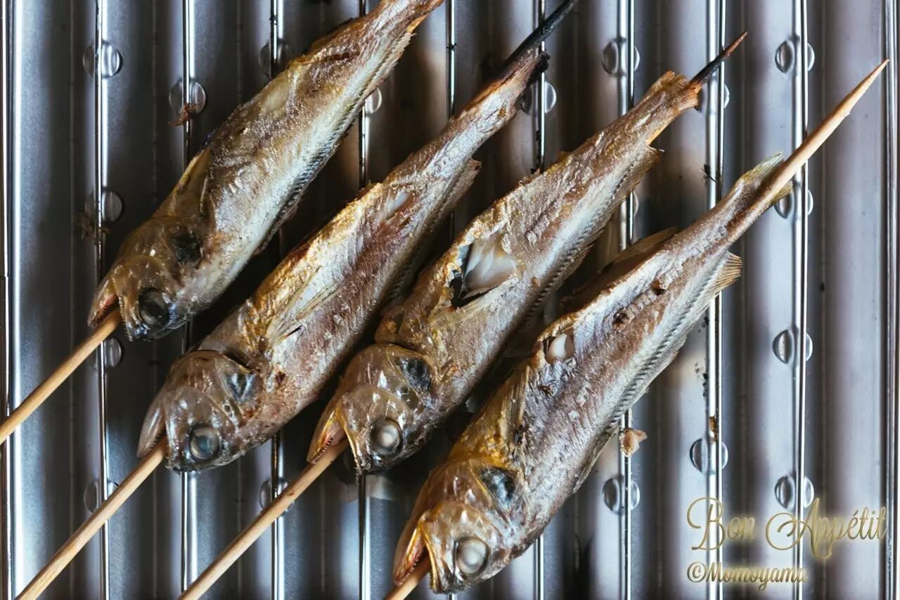 2. 用竹签从鱼?嘴巴插入,贴着背脊,鱼尾处出签。开火,放上烤架预热,放上鱼,每面烤大致2-3分钟,撒盐,两面呈金黄色便已烤熟。