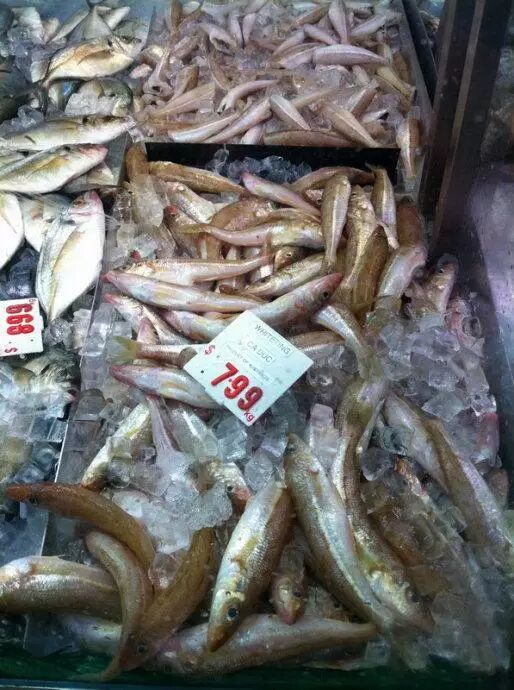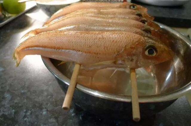 这红斑鮻是在小西贡菜市场以每公斤$8.00购入。没经验的煮妇煮夫极容易被骗,大家可以看到照片近处是大规格的红斑鮻(未去头去内脏), 而远处的则是去了头和内脏的小规格银鮻。您要是说想买点儿,卖家则会从小规格银鮻那堆挑选。我买的时候卖家也是这样做的,我说不、不行,给我近处带头带内 脏的 ^0^。这么大规格的红斑鮻卖$10.00也不过分。