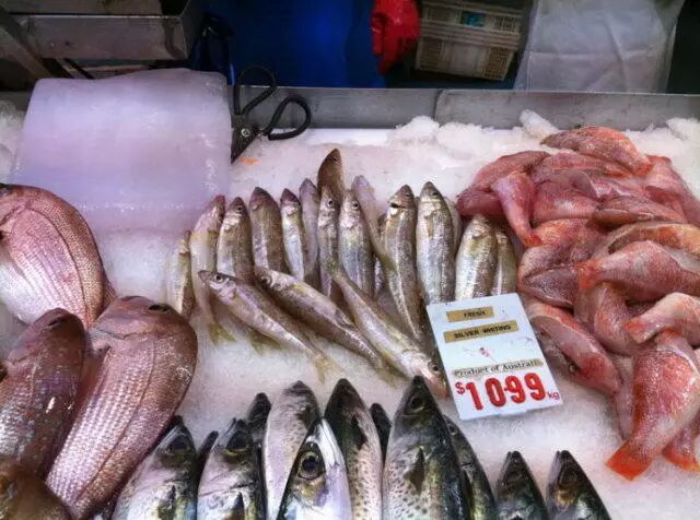 这六条银鮻是在与小西贡相隔200米的Footscray福贵菜市场买的 - 十分新鲜 - 每公斤$11.00元。它的个头大小可以和左边的真鲷相比较。