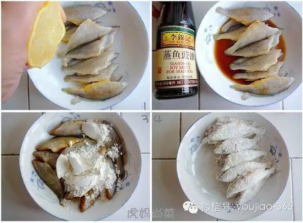 材料:小黄鱼10条,柠檬1片,蒸鱼豉油2勺,盐1勺,面粉4勺。