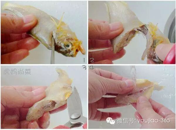 1. 用剪刀在紧贴鱼头的部位剪开。