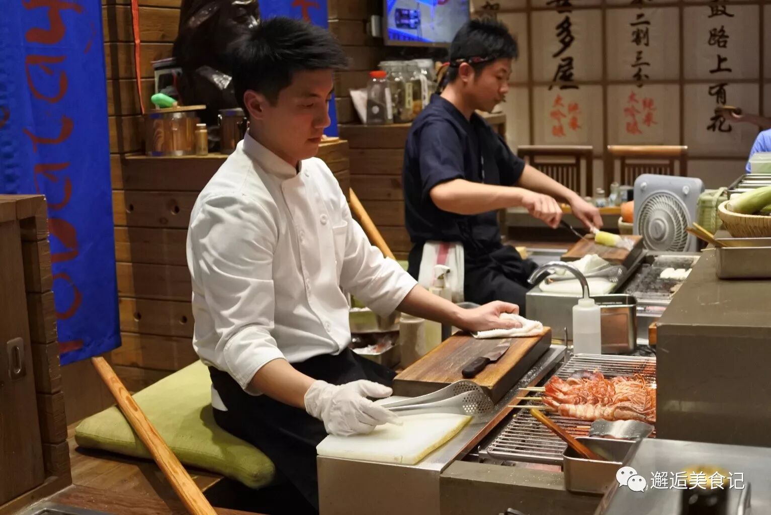 烤虾的时候,炉端烧对火候要求严格,帅气的料理师傅一丝不苟