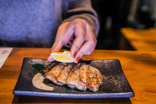 只用最简单的味盐调味,炭烤后滴上柠檬汁,趁热吃上一口,香香脆脆的,一点都不油腻。