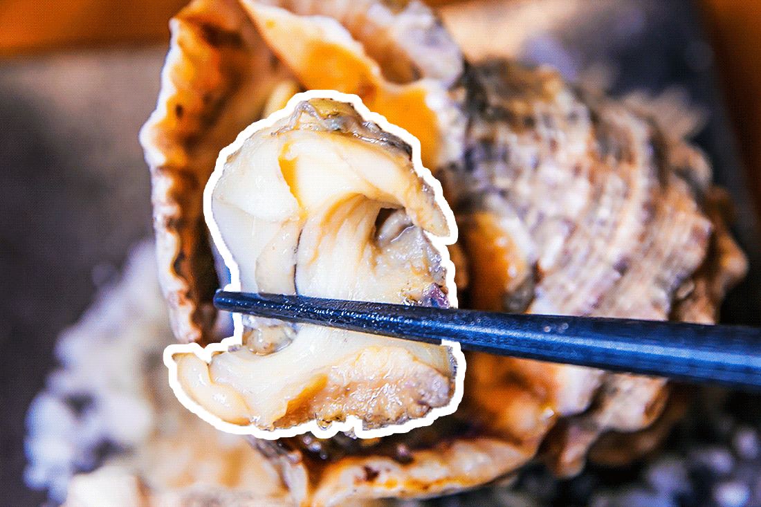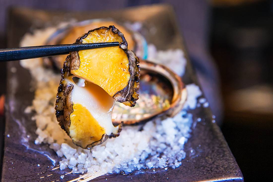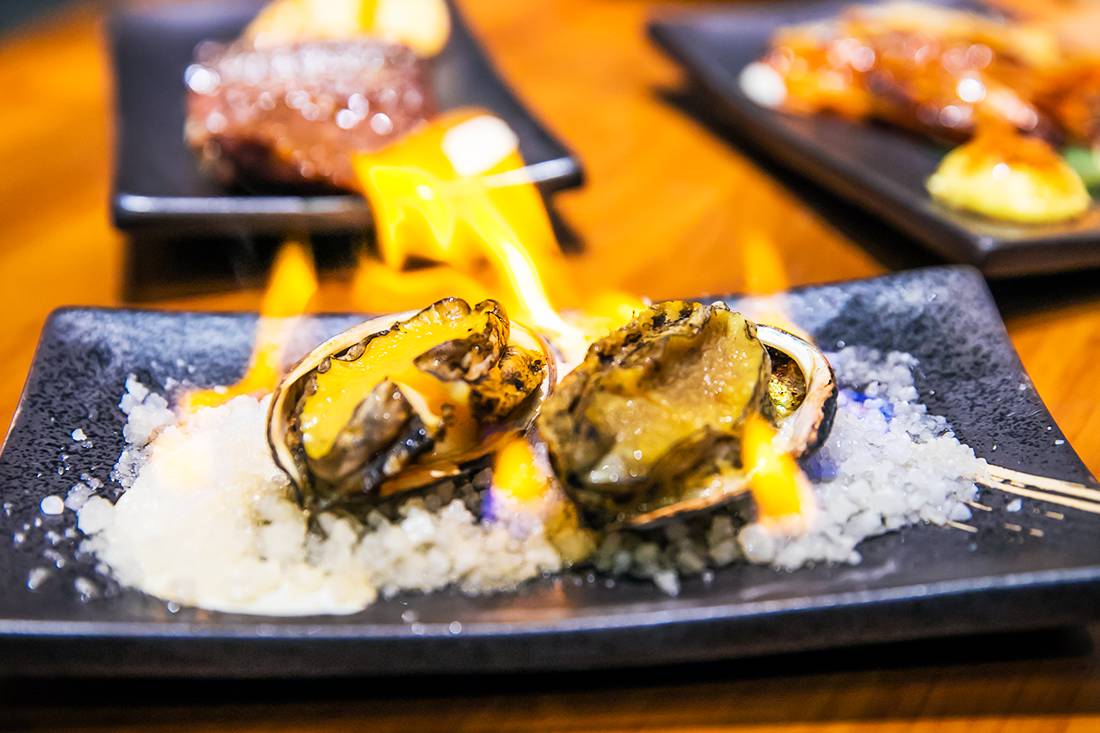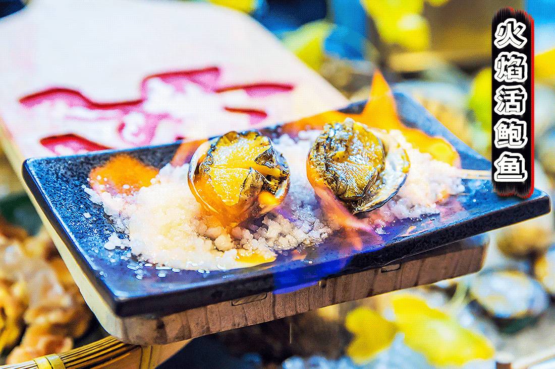 在火焰上跳舞的新鲜活物:火焰活鲍鱼、火焰活海螺。950度高温的烤炉上炙烤时还喷着海水,有多新鲜可想而知。