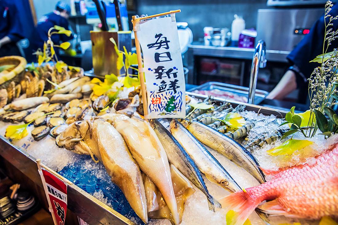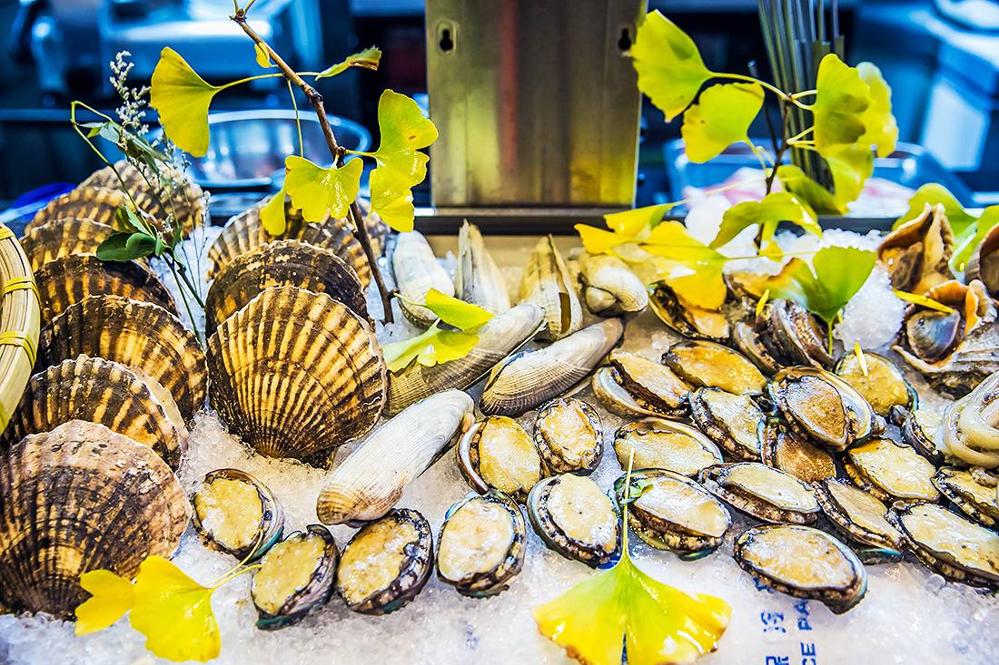 琳琅满目的生鲜海产、当季鲜蔬整齐的铺满吧台,新鲜看得到!