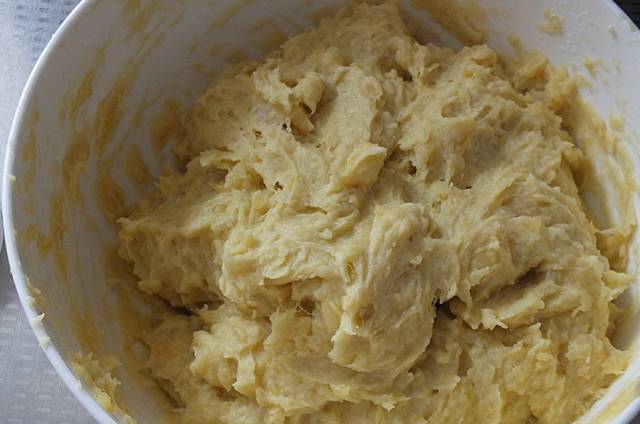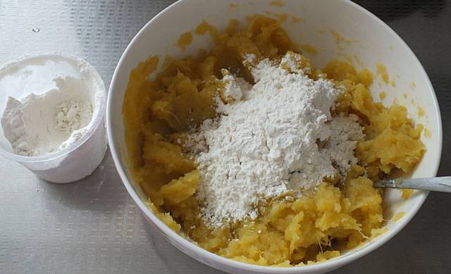 去皮,放入碗内趁热加点白砂糖用勺子压成泥。