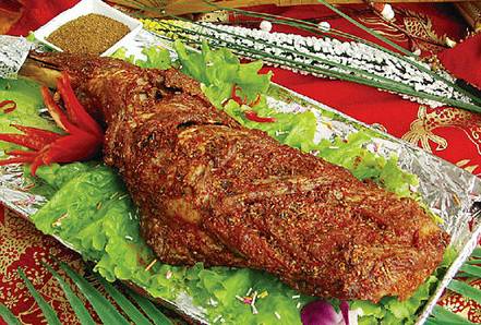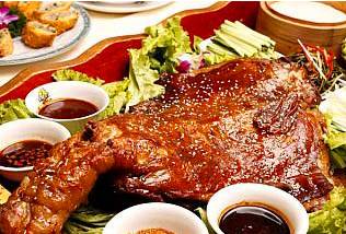 烤羊腿是内蒙招待宾客的一道佳肴名菜,是从烤全羊演变而来.相传,生活在中国北方广阔大地上的狩猎和游牧的民族,常在篝火旁烘烤整只的猎物和整羊进食.人们逐渐发现整羊最好吃的部位是羊后腿,便经常割下羊后腿烘烤.单独烘烤的羊后腿不但比烤整羊的时间快,而且味道更加鲜美,食用方便,烤羊腿遂渐渐代替了烤整羊.
