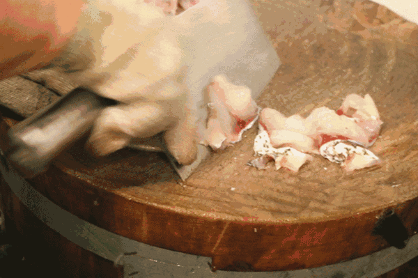 切单飞片,厚切,每块厚度在3毫米左右。为了确保每片脆肉鲩都是恰好熟。烫的时候每片控制在10秒。虽说脆肉鲩的久煮不烂、不变其口感。但广东的食客一致认为鱼片的最佳赏味期10秒足矣。