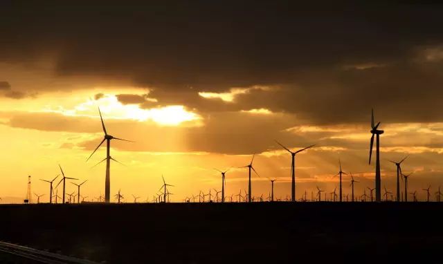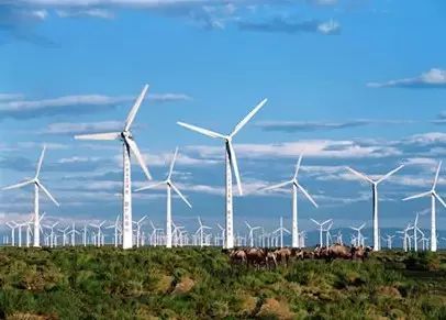上百台风力发电机擎天而立、迎风飞旋,与蓝天、白云相衬,