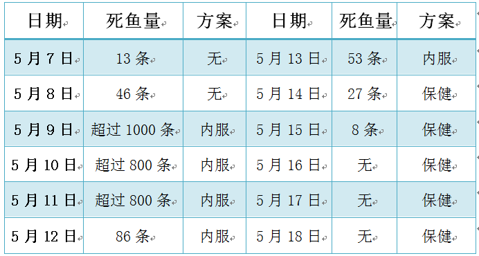 5月9日—11日水体消毒:每次用1瓶海联科聚维酮碘(500ml)兑水泼洒在网箱里面及网箱外围2米处。