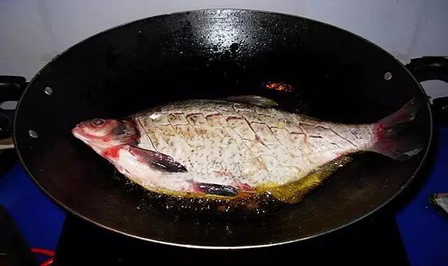 第二步:向锅内加入植物油,中火烧热,然后放入武昌鱼,煎至两面金黄;