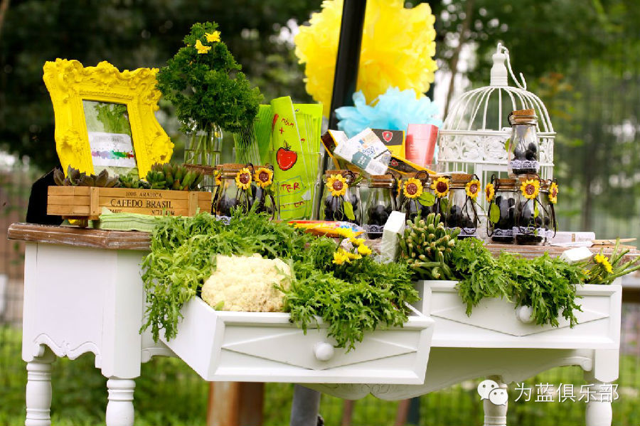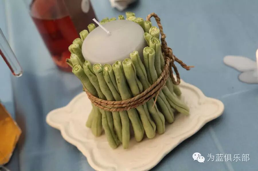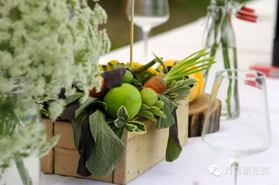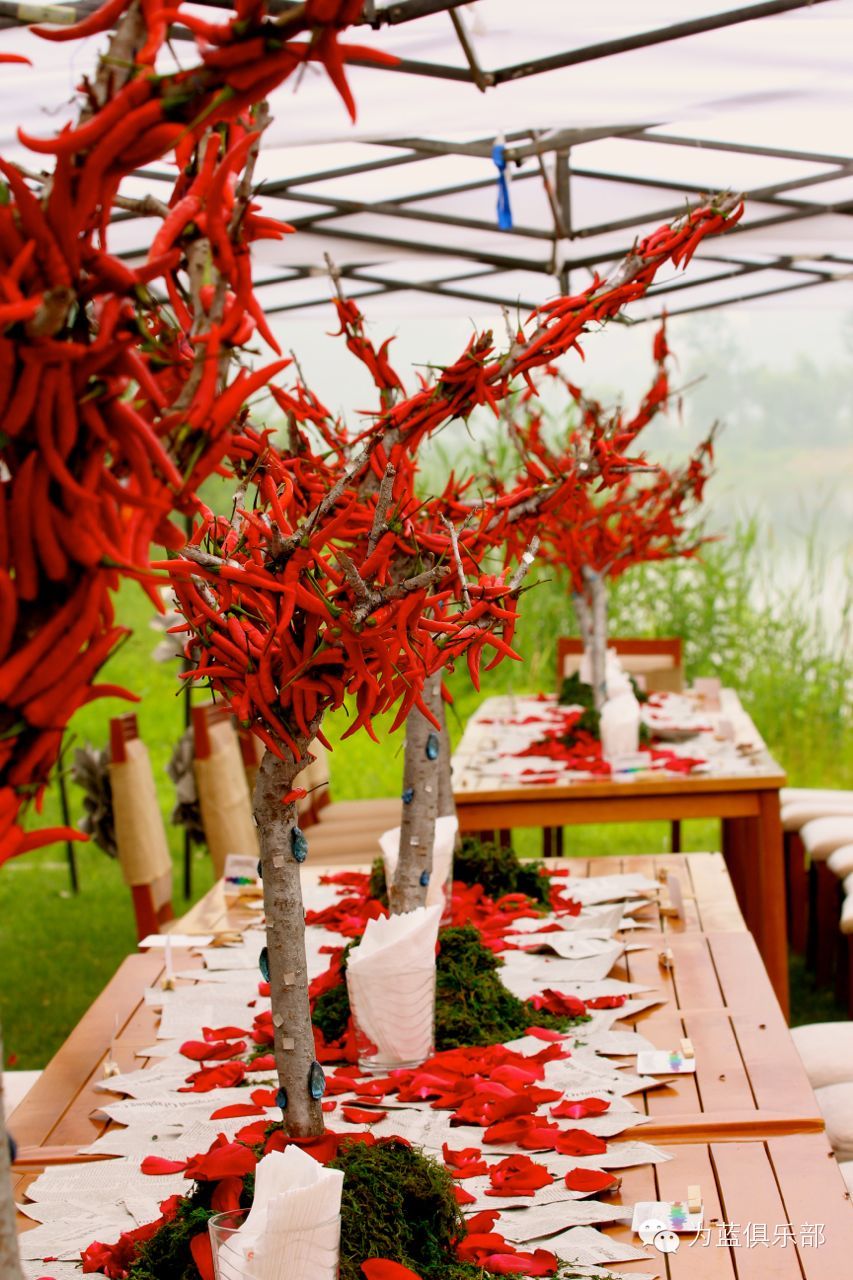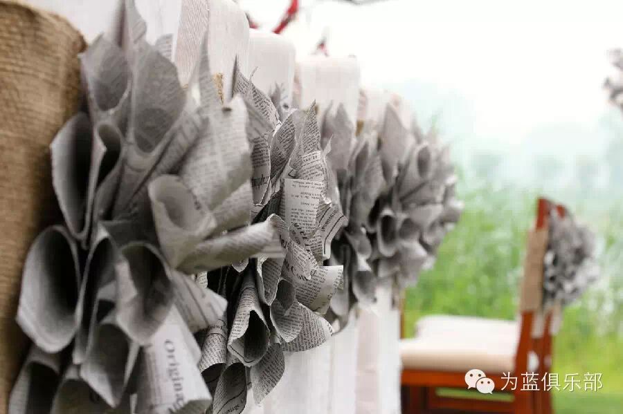 婚礼的布置采用了湿地的野花、野草、应季的蔬菜、湖边的鹅卵石、回收纸张等素材,尽一切可能避免采用一次性用品、以及长途运输的物料,如:进口或外地产鲜切花、一次性塑料器具、塑料瓶装饮料、鞭炮礼花、喷雾彩带等。大家猜猜图中的新人胸花是用什么材料制作的?![]()