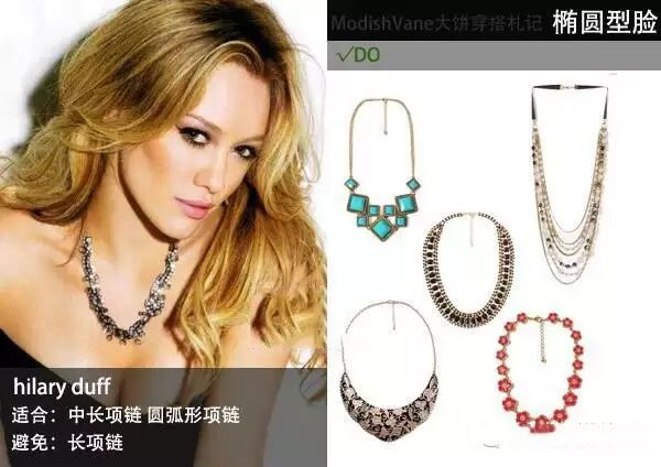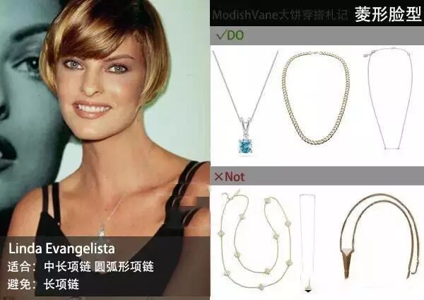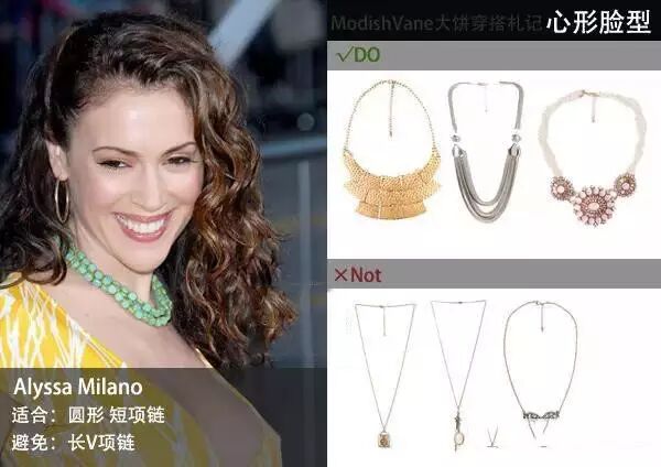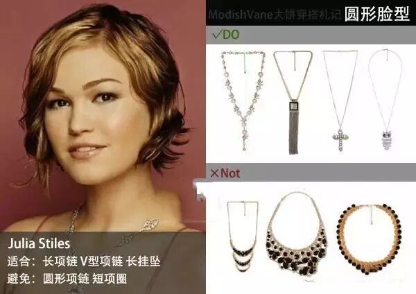 容易让人觉得肉肉的圆形脸型,造型特点是需要让你的脸看起来更长适合:所以要挑选的项链需要能够延伸你的先把和脖颈,大饼推荐圆脸姑娘们可以尝试各种带吊坠的V形项链,当然如果吊坠能够有延伸感那么更好。避免:需要避免的是贴颈式的项链,项圈、短项链等,尤其是圆形大珠子的项链和圆圆大大的挂坠项链,它们都会让你的脸看起来更圆。