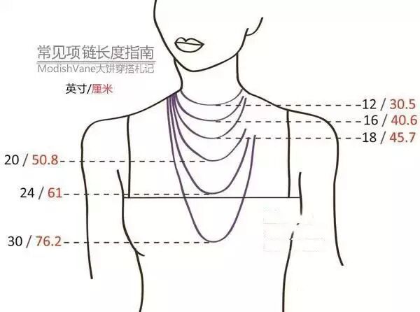 其实道理不用多说,相信大家都懂的咯。首先,咱普及一下项链的名称:根据国际标准的尺度,在36~40厘米之内的叫短项链;42~107厘米的叫渐层型项链:其中,42厘米的叫公主项链,54厘米的叫晨装项链,71厘米的叫礼服项链;超过107厘米的叫长项链或超长项链。