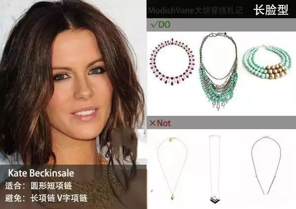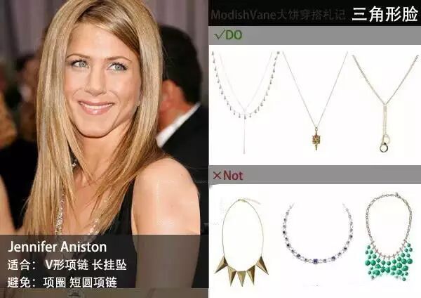 容易让人觉得肉肉的圆形脸型,造型特点是需要让你的脸看起来更长适合:所以要挑选的项链需要能够延伸你的先把和脖颈,大饼推荐圆脸姑娘们可以尝试各种带吊坠的V形项链,当然如果吊坠能够有延伸感那么更好。避免:需要避免的是贴颈式的项链,项圈、短项链等,尤其是圆形大珠子的项链和圆圆大大的挂坠项链,它们都会让你的脸看起来更圆。
