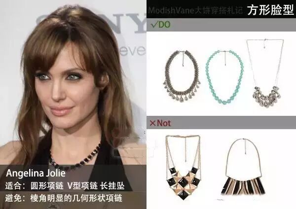 要修饰方形脸型的硬朗轮廓,可以采用圆弧形状的项链,如水滴型、椭圆型、或长弧形的项链,能弛缓脸部的角度。各种轮廓太硬朗的几何形项链尽量避免除非你想让自己看起来更man。