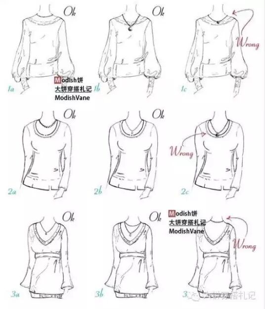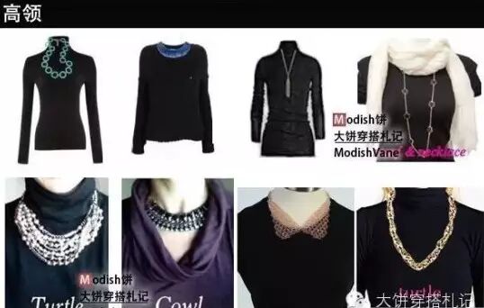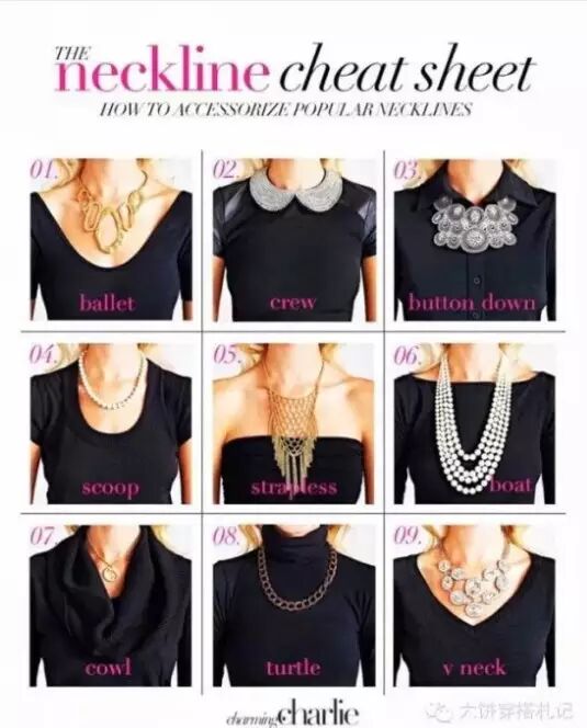 从与服装的搭配来看,项链的长短和领口的重合是要避免的,这样会让你的搭配不干净,不要有太多的留白和空挡,这样也会让你的搭配觉得不协调,嗯一句话,不多不少,刚刚好。哈哈!最后,小编整合了一些欧美搭配师的项链与衣领的搭配,亲们留图吧: