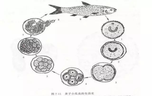 小瓜虫的繁殖经历滋养体、包囊、掠食体三个阶段:滋养体阶段、包囊阶段和掠食体阶段。在滋养体阶段,小瓜虫寄生在鱼皮之下缓慢生长,这一阶段由于鱼皮的阻挡,药物很难渗透进去;在包囊阶段,小瓜虫寄生成熟之后脱离鱼体,自由游动约3到6小时后落到水体底部,分泌一层胶质的包囊,然后孵化出500到1000只幼虫,这一阶段小瓜虫对药物敏感的时机相当短暂;在掠食体阶段,从包囊中孵化出来的小瓜虫幼虫有1到2天的时间寻找宿主鱼寄生,如果没有及时找到宿主,小瓜虫幼虫会自行死亡,这一阶段也是小瓜虫的药物敏感期。最适合施药的掠食体阶段持续时间固定为1到2天,但是小瓜虫的整个繁殖周期却视气温不同从4天到30天不等。在气温30℃以上时,虫体不能发育,所以炎热的夏天通常不会发生白点病。在24℃时,繁殖周期为4天。15℃时,繁殖周期为10天。而10℃以下时,繁殖周期往往在30天以上,这是由于低温时成虫长时间停留在鱼体内的滋养体阶段,而这一阶段恰是施药无效的时期。