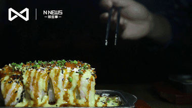 把 鳗鱼,紫苏,青瓜丝 满满的塞进寿司饭里,卷成一卷再过油炸一遍,顶部铺满芒果蟹子,一上桌香味就止不住四散。