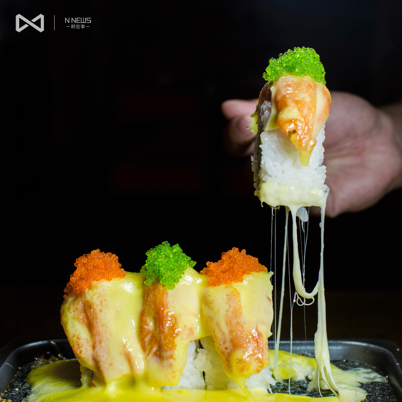 吃个寿司卷都能拉出丝,芝士控已尖叫!不仅芝士量暴涨,还特地 添加了芒果酱,三文鱼入口化,融合芝士与酱汁,口感超丰富!