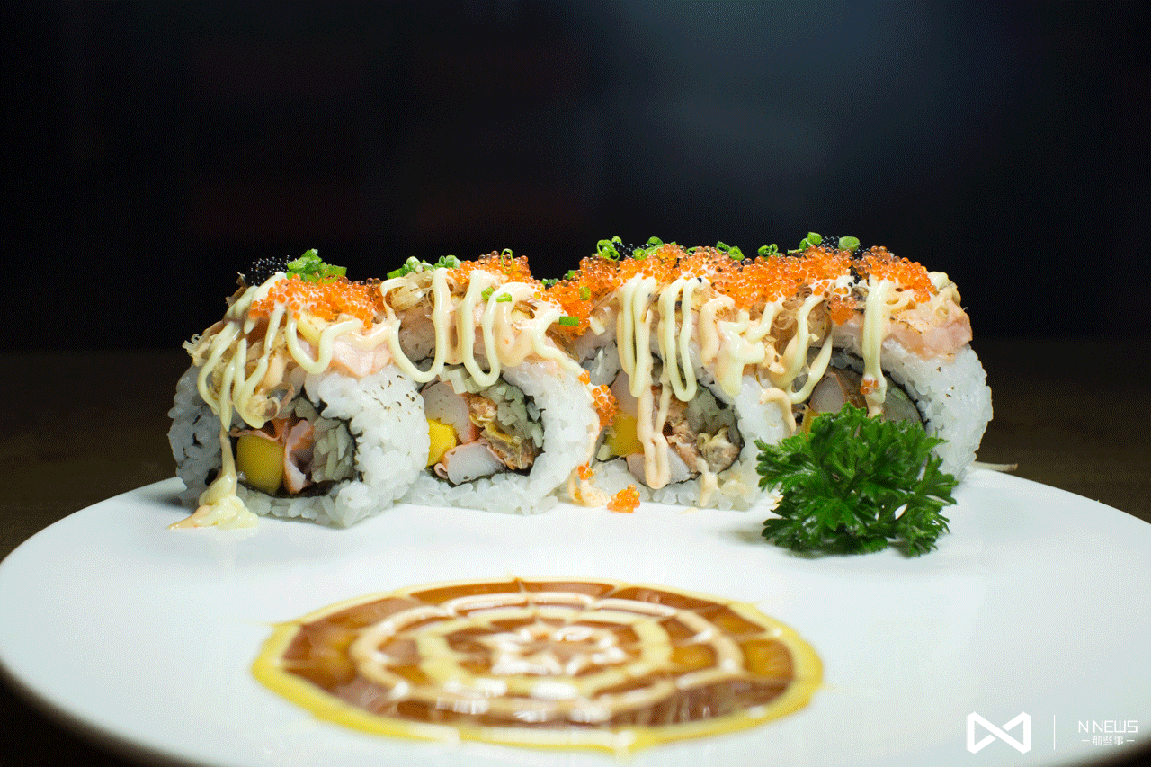 用料超足,卷内包着 三文鱼皮、芒果、蟹柳 等食材,外面则是 三文鱼、炸鱿鱼丝和 厚厚的沙律酱。看着就食欲大增!