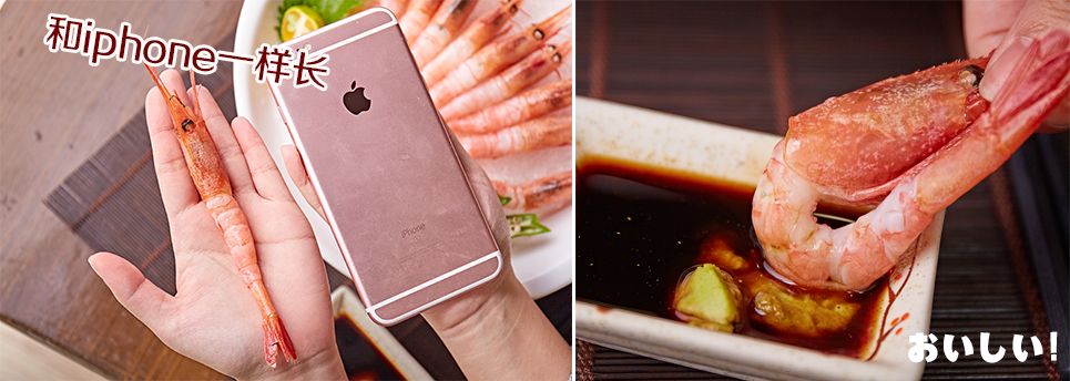甜虾长度跟iphone一样,而且它的肉极富有弹性,蘸芥末酱油更加提鲜,吃起来清凉爽口。
