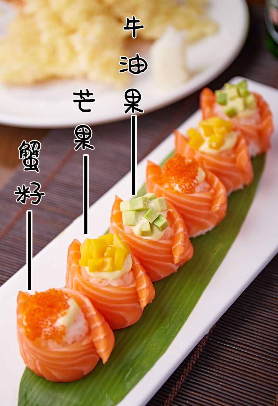 花之恋一盘中有三种口味,蟹籽的口感比较有趣,在口中不断“爆发”;芒果与三文鱼挺配的,酸酸甜甜很开胃;牛油果吃起来比较清新,没有什么腥味。