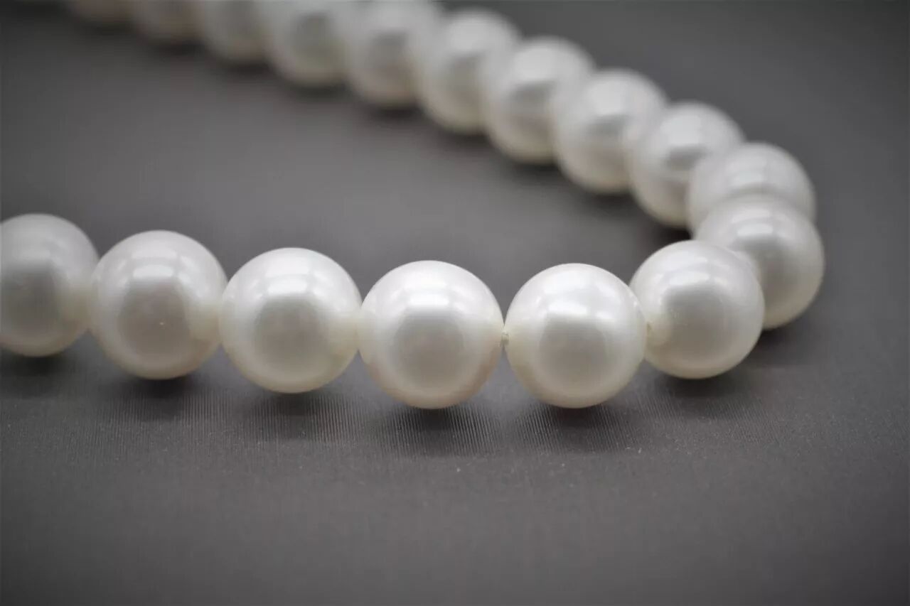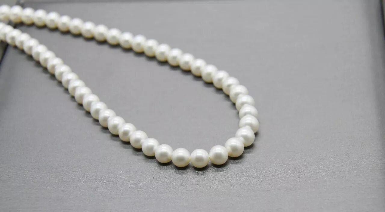 再看圆度,我们把最大直径和最小直径之差与平均直 径之比小于百分之一的珍珠叫做正圆珠,一般用来做珍珠吊坠(比如路路通,以及其他单颗款式的珍珠项链);圆珠是指肉眼看形态很圆,直径差百分比在百分之一和百分之五之间的珍珠;直径差百分比在百分之五和百分之十之间的珍珠叫做近圆珠,我可以坦白告诉大家,现在市面上,尤其某平台,绝大部分珍珠项链,其实连近圆珠都算不上,大部分是椭圆珠和米珠。我们这条项链的珍珠圆度,符合圆珠的级别。