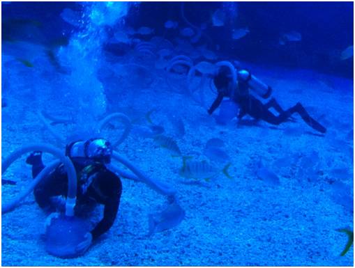 (吸底工作:潜水员吸走附着于底砂的鱼类粪便和饵料残渣)