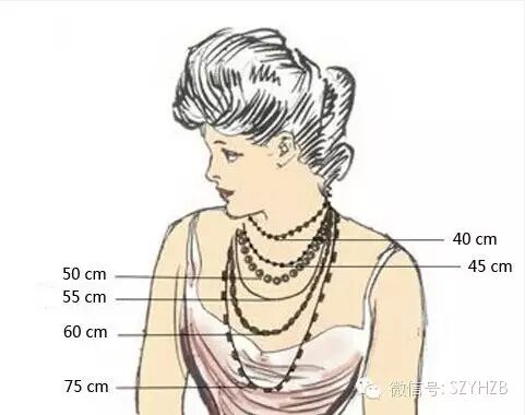 一般来说,叠搭项链,就是“短+中+长”,大家根据上面这张示意图来看,把几根不同长度的项链叠加着戴,感觉层次感分明、上半身细节感非常丰富。当然,上图所标尺寸为普通尺寸,你也可以根据自己的搭配心得来主导尺寸大小变化。