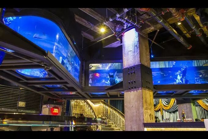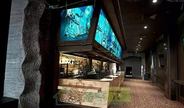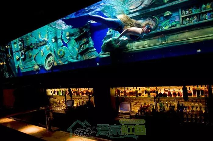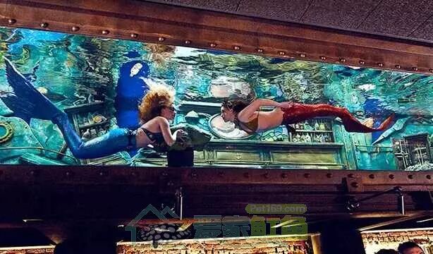 加州28000升的美人鱼潜水酒吧,这个鱼缸悬挂在吧台上方,有了鱼缸和美人鱼的点缀,让这里看起来像一艘神秘的船上酒吧。