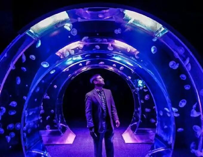 在韩国首尔的水母走廊,由两个相同的拱形鱼缸构成,每个约4500升水,里面有200只月亮水母