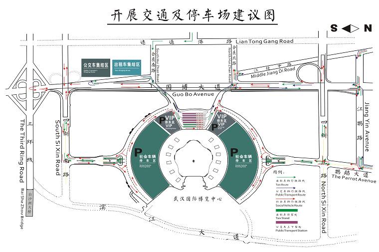 鹦鹉洲大桥方向过来车辆:鹦鹉洲大桥—二环线—江城大道匝道下—江城大道—四新南(北)路—国博中心