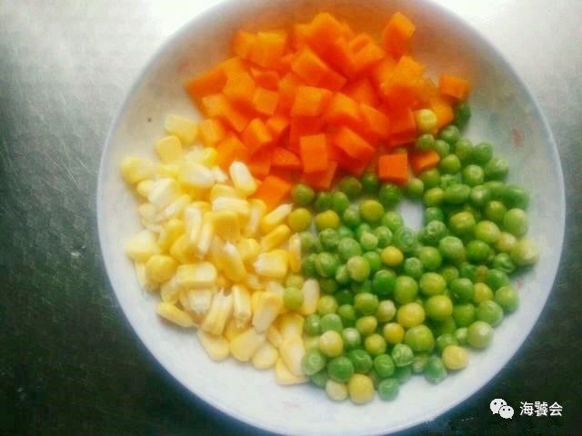 3:胡萝卜切粒,青豆解冻,玉米粒备用