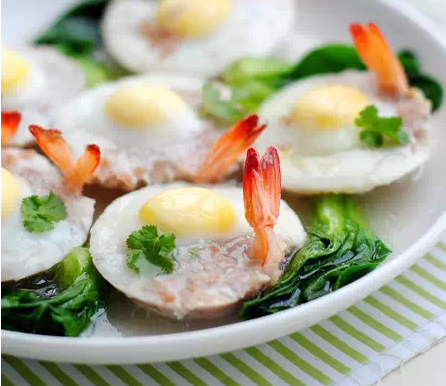 原料:虾6条、猪肉末150g、青菜6棵、鹌鹑蛋6个、火腿末1大匙,香菜末少许、小碗、姜末、葱末、胡椒粉1小勺、料酒1小匙、盐1小匙、水淀粉、高汤、香油1匙、生抽1匙、蚝油1匙