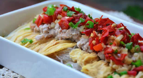 原料:腐竹、粉丝、肉末各适量、蒜、料酒、盐、白胡椒粉、剁椒、生抽各适量