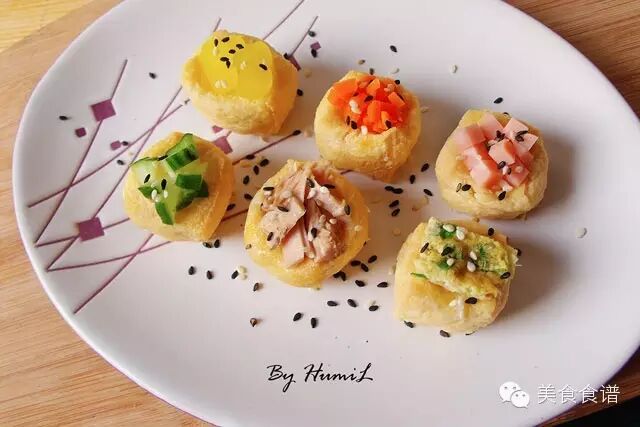 2、煮一锅热饭,倒入适量的盐,醋和糖,调成醋饭,放凉备用3、煮热水,加点酱油和鸡精调一点味,把油豆腐下去煮一会4、油豆腐一面开一个小口,等醋饭凉了之后,把它釀在油豆腐里7、最后撒上一点芝麻就行了,胡萝卜、黄瓜、火腿、腌萝卜切碎按之前的步骤做就可以了。1、材料内容可以按自己的喜好,沙拉酱可以不加,但是材料要调味 3、煮油豆腐不用太久,因为本来就是熟的,煮的汤可以用高汤更好