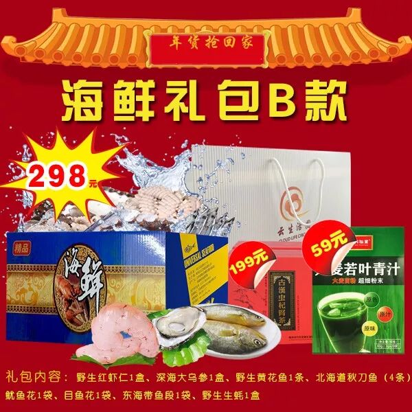购海鲜礼包B款,送消费分红等值云币+健康礼包B款.
