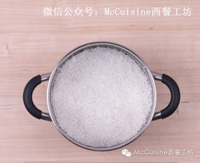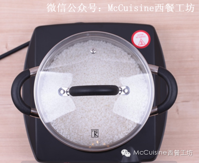 3. 然后把清洗好的大米放入厚底平底锅内,加入250克水(请记住米和水一定是1:1)。